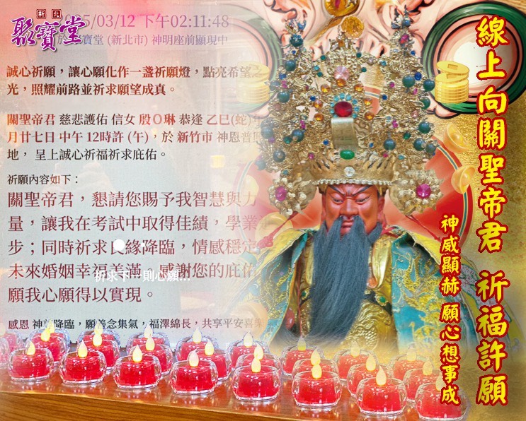 新北聚寶堂-向關聖帝君線上高效祈願,獲取神恩。許下心願,心裡默想如願後如何答謝。關公會感受到你的誠意,賜予你滿滿的福氣。若沒時間,改線上,每日只要25分鐘,一定很快會感受到被祝福的感覺